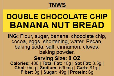 Unique and delicious blend of banana and chocolate chip goes into making our Double Chocolate Chip Banana Nut Bread vacuum sealed in a jar stays moist and fresh for a long time.